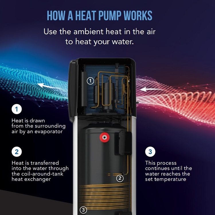 Công nghệ bơm nhiệt hiệu quả chiết xuất năng lượng từ không khí xung quanh. Hơi ấm xung quanh được sử dụng để chuyển đổi chất làm lạnh trong hệ thống kín thành khí. Sau đó khí được nén để tạo ra nhiều nhiệt hơn, sau đó làm nóng nước trong bình. Hơn nữa, quy trình này có thể hoạt động cả ngày lẫn đêm, nắng mưa, quanh năm.