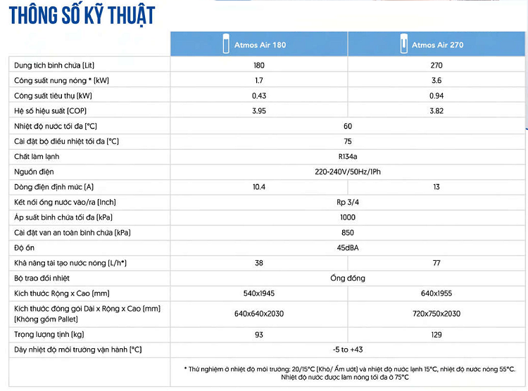 - Hiệu suất cao: Nhờ công nghệ tiên tiến, một Máy Bơm Nhiệt Solahart Atmos Air có thể đạt đến Hệ Số Hiệu Suất (COP) 3.8 giúp thiết bị trở thành máy nước nóng hiệu suất cao.